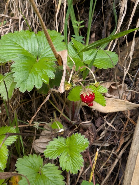 It would probably be easier to walk along the road: the trail goes up and down all the time. But there are strawberries here. Just ordinary wild strawberries, which don't grow here in Michigan. We hide them as we go, pick a few berries, and pop them into our mouths. That alone made the trail worth it.