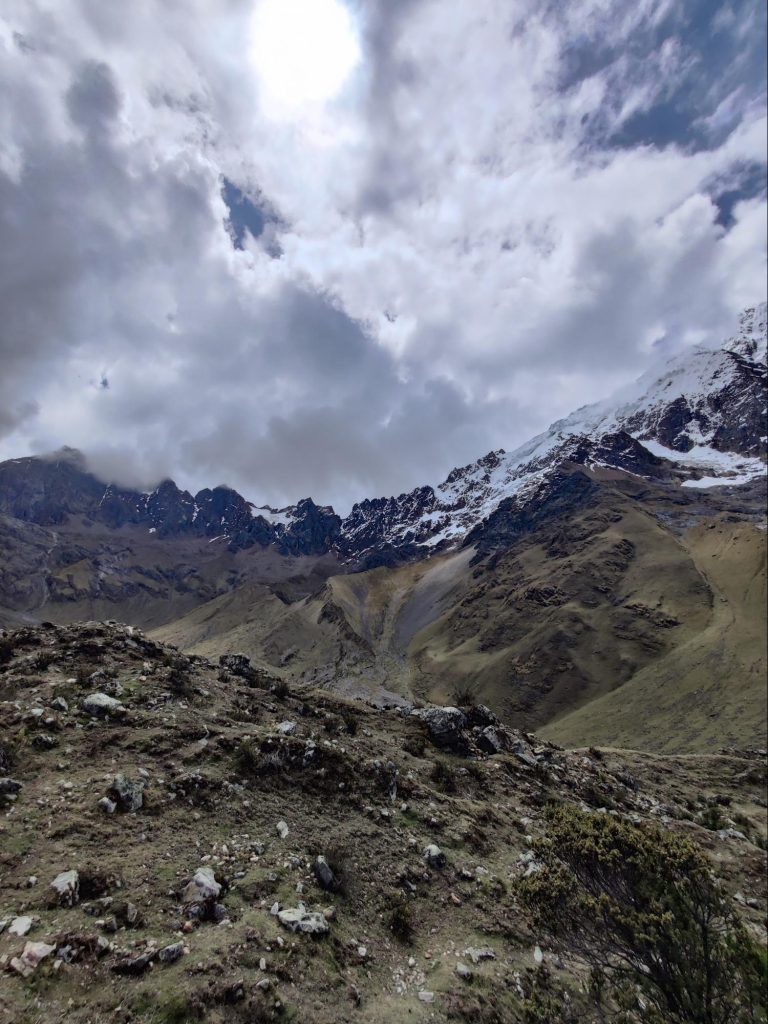 The trail immediately climbs steeply. In the thin mountain air, my head immediately starts to ache and I feel slightly nauseous. Perhaps it's the effects of driving on mountain roads, or maybe altitude sickness is taking its toll. We continue along the trail, and Mount Salkantay looms ahead, as if encouraging us.