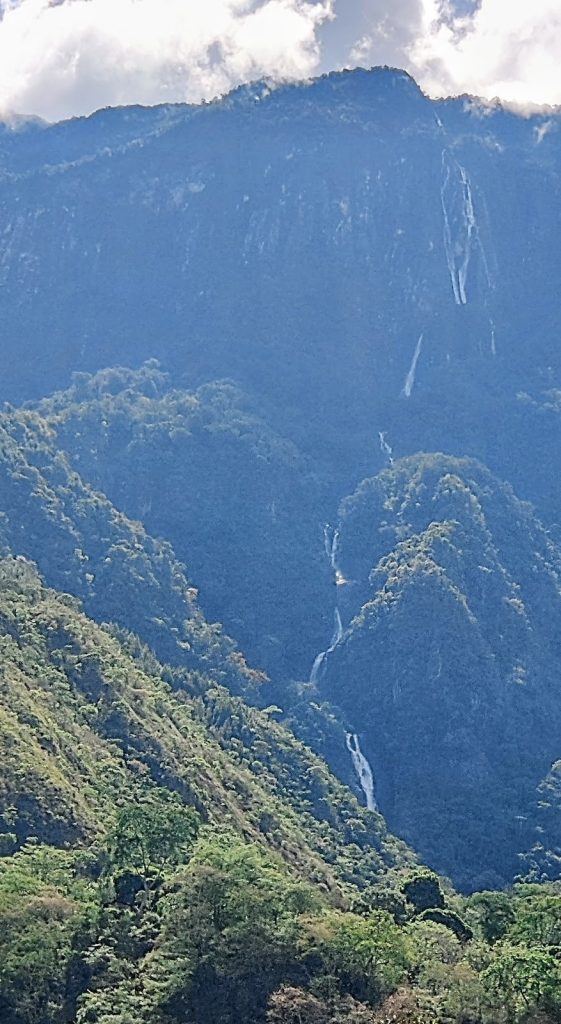 Похоже источник бил с самой вершины горы. Разбиваясь о скалы, вода падала с немыслимой высоты, пробивая себе путь сквозь джунгли к реке Урубамбе. Четко мы могли видеть лишь нижнюю часть водопада, а все, что было вверху, терялось в голубой дымке.