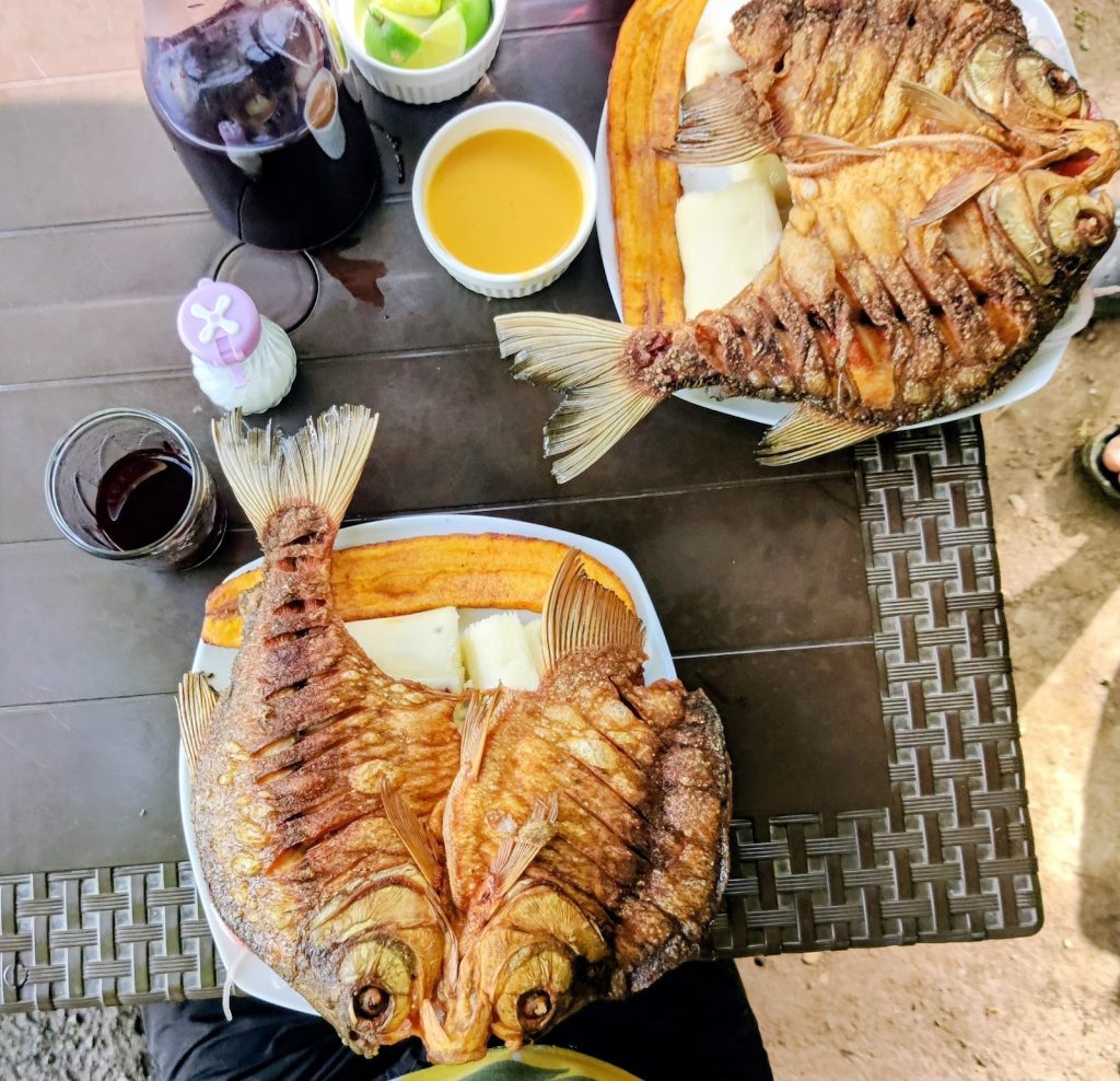 За скромную цену мы роскошно пообедали в придорожном ресторане и остались очень довольны. На гарнир к рыбе нам подали жареный плантейн и местную сладковатую картошку.