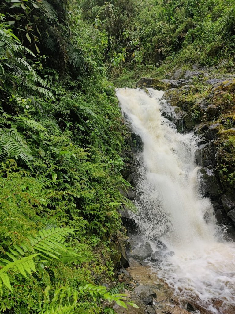 Поскольку на обратном пути распогодилось, появилась возможность увидеть ещё один водопад. Мы не заметили его раньше оттого, что все вокруг было затянуто облаками и туманами и находился он в некотором отдалении. К тому же мы сконцентрировались на непростом процессе езды по местным дорогам, которые сначала были ещё ничего, а потом превратились в сплошные ямы и колдобины с лужами вперемежку.