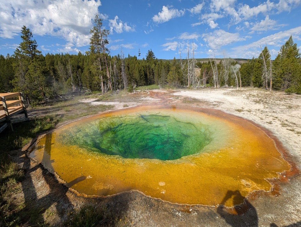 От дальнего конца поляны идёт тропа под названием “ЛЭП”. Ничего выдающегося на ней нет, только местами открывается хороший вид на долину гейзеров. И именно здесь мы первый раз увидели бизона. По тропе мы доходим до горячего источника “Призматик”, который накануне видели только с обзорной площадки.
