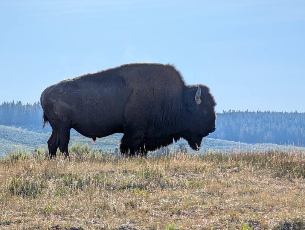 Около дороги мощной глыбой стоит бизон. Он огромен и невозмутим. Размеры зверя впечатляют. Монолит! Колосс! Конечно, мы останавливаемся на обочине и, не вылезая из машины, прямо из открытого окна фотографируем животное.